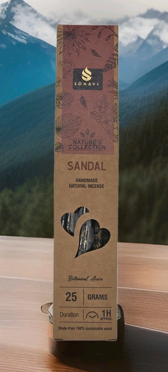 Sonavi presents its handmade natural incense featuring a harmonious scent of Sandal from the Nature's collection line. These eco-friendly, non-toxic, and cruelty-free incense sticks are crafted with care, ensuring a pure and aromatic experience. 25-gram pack with each stick designed to burn for approximately one hour, allowing for extended enjoyment of their soothing fragrances.. Proudly made in India, this incense is perfect for enhancing relaxation and creating a serene atmosphere in any space.