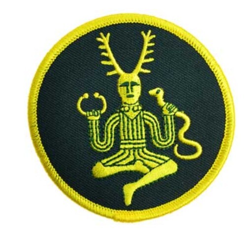 A golden Cernunnos, Lord of the Hunt, as depicted on the Gundestrap Cauldron, against a green background, with gold edging and an interwoven red pentagram between his antlers. This sew-on patch measures 3"