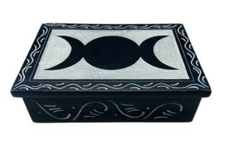 Solid soapstone Triple Moon box with removable lid. Large enough to keep safe many of your favorite items. Size is approximate and slight imperfections may be present.