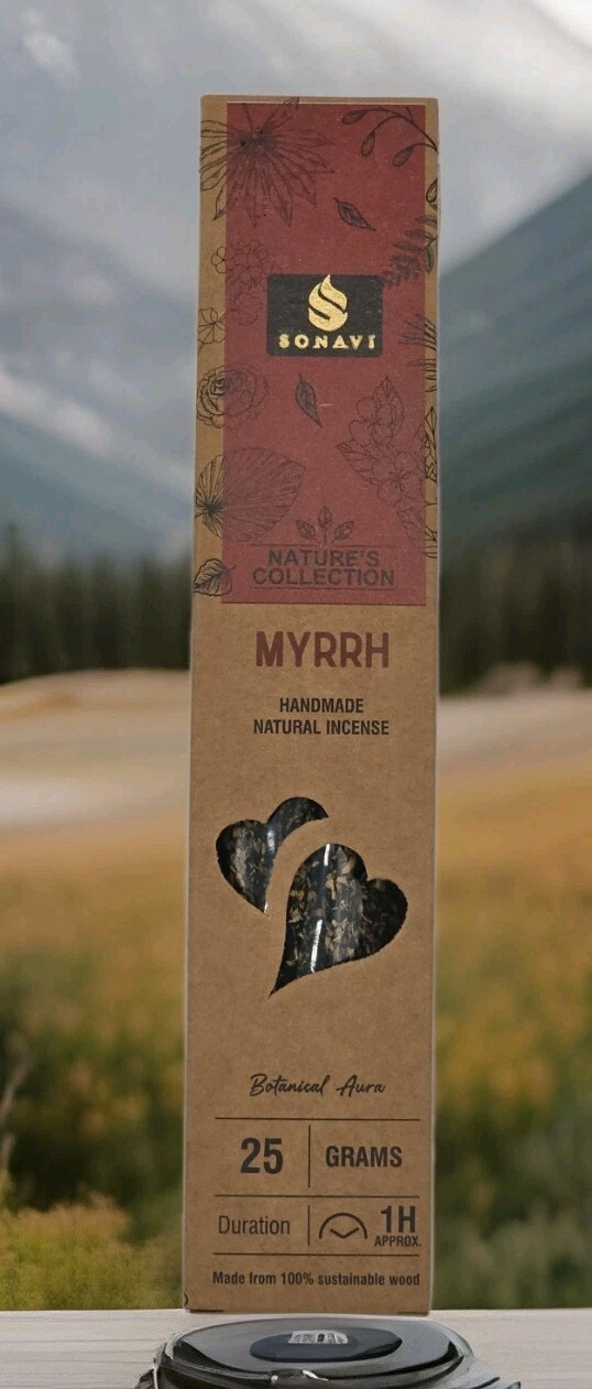 1 Box of Sonavi Premium Handcrafted Myrrh Incense Sticks. 25gm per box. Excluding Tax: $0.30 $3.95 Add To Cart Buy Now Call Us WhatsApp Description Sonavi presents its handmade natural incense featuring a harmonious scent of Myrrh from the Nature's collection line. These eco-friendly, non-toxic, and cruelty-free incense sticks are crafted with care, ensuring a pure and aromatic experience. 25-gram pack with each stick designed to burn for approximately one hour, allowing for extended enjoyment of their soothing fragrances. Proudly made in India, this incense is perfect for enhancing relaxation and creating a serene atmosphere in any space. Delivery Orders are packed and shipped same day if the order is placed before 3:00p.m. Central Standard Time. All orders are shipped via standard delivery. If you require expedited delivery, please contact us.