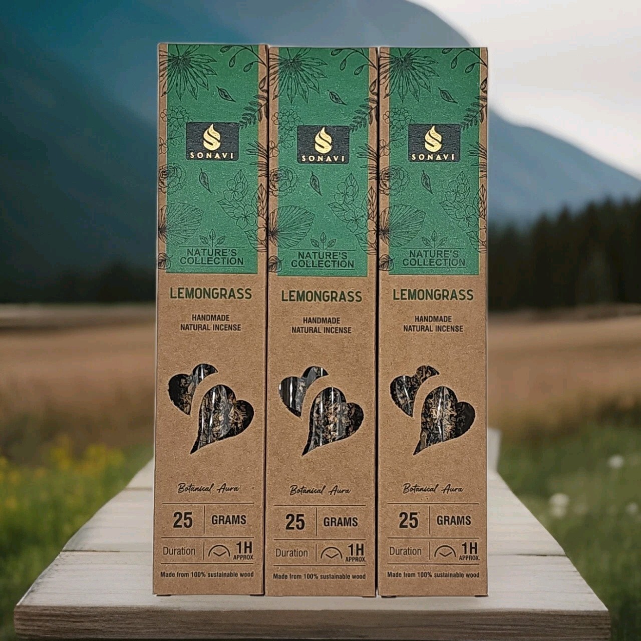 3 Boxes of Sonavi Premium Handcrafted Lemongrass Incense Sticks. 25gm per box.