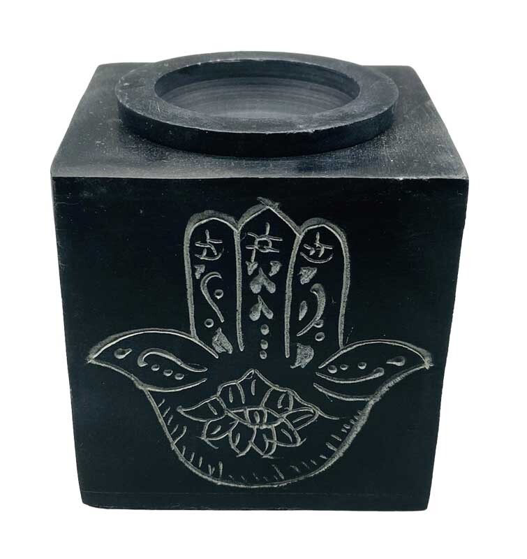A solid soapstone burner completed with Hamsa Hand etching along the sides. The matte black finish makes the designs pop. 3" Square